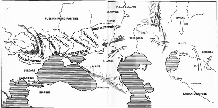 The newly acquired Pecheneg territory stretched from the border of the Khazar Empire, Middle Don and Volga to the north and east and to the Carpathians and the Lower Danube to the west. The Pechenegs were not a uniformed people, but a group of tribes. According to the information provided by Roman Emperor Constantine VII Porphyrogenitus in the 10th century, the Pechenegs were a confederation of eight tribes – Giazichipon, Chabouxingyla, Iabdiertim, Charaboi, Kouartzitzour, Syroukalpei, Borotalmat and Boulatzopon (Pálóczi Horváth 1989, 12). During the next century and a half the tribal system described by Constantine VII was gradually transformed with the population growth, detachment of some clans and the arrival of others from the east. By the mid-eleventh century we find 13 Pecheneg hordes (Pálóczi Horváth 1989, 15-16).